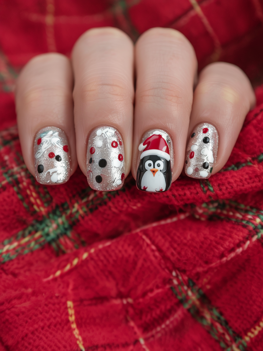 A look best suited for short square or rounded nails, it channels low-maintenance vibes while bursting with personality. A gel finish would lock in metallic shine while keeping the penguin artwork sharp. These are especially great for girls wanting an approach filled with cutie characters and holiday sparkle.