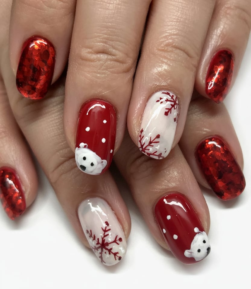 This is a great option for short to medium nails, perfect if you want something fun yet practical. Gel polish keeps the red bold and the polar bear art crisp. A sweet inspo choice for women who like animal designs with a holiday twist.