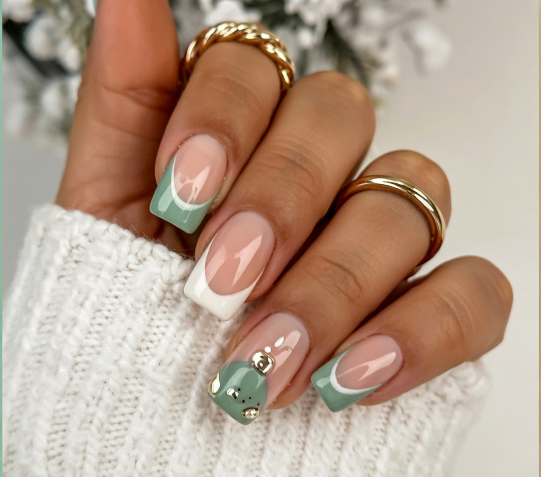 A great design would go well with square or short almond shapes, trendy but still very wearable for regular activities. It is best for women who prefer their looks to be minimalist but don’t want to completely lose the fun factor. A gel overlay will bring out the brightness of the green tips and keep the cute bear design intact through all those holiday toasts.
