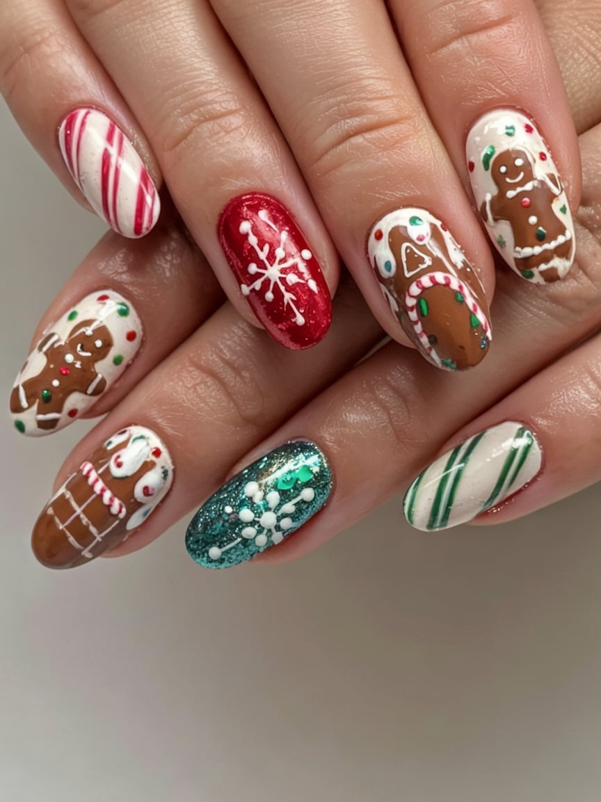 These nails are a true holiday treat. Gingerbread men, houses, candy stripes, and snowflakes come together in a colorful, detailed set. It’s fun, festive, and perfect if you want your nails to feel like a Christmas cookie spread.