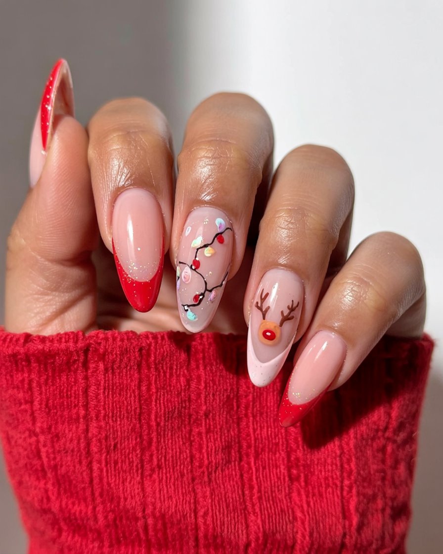 The whole vibe with this set is classy but playful. The red French tips are still very much style staples, while the string lights and Rudolph accent nail add that cherry-on-top mischief. It’s one of those designs where you absolutely want to keep it classy but really want to ram the festive spirit down everyone’s throats.