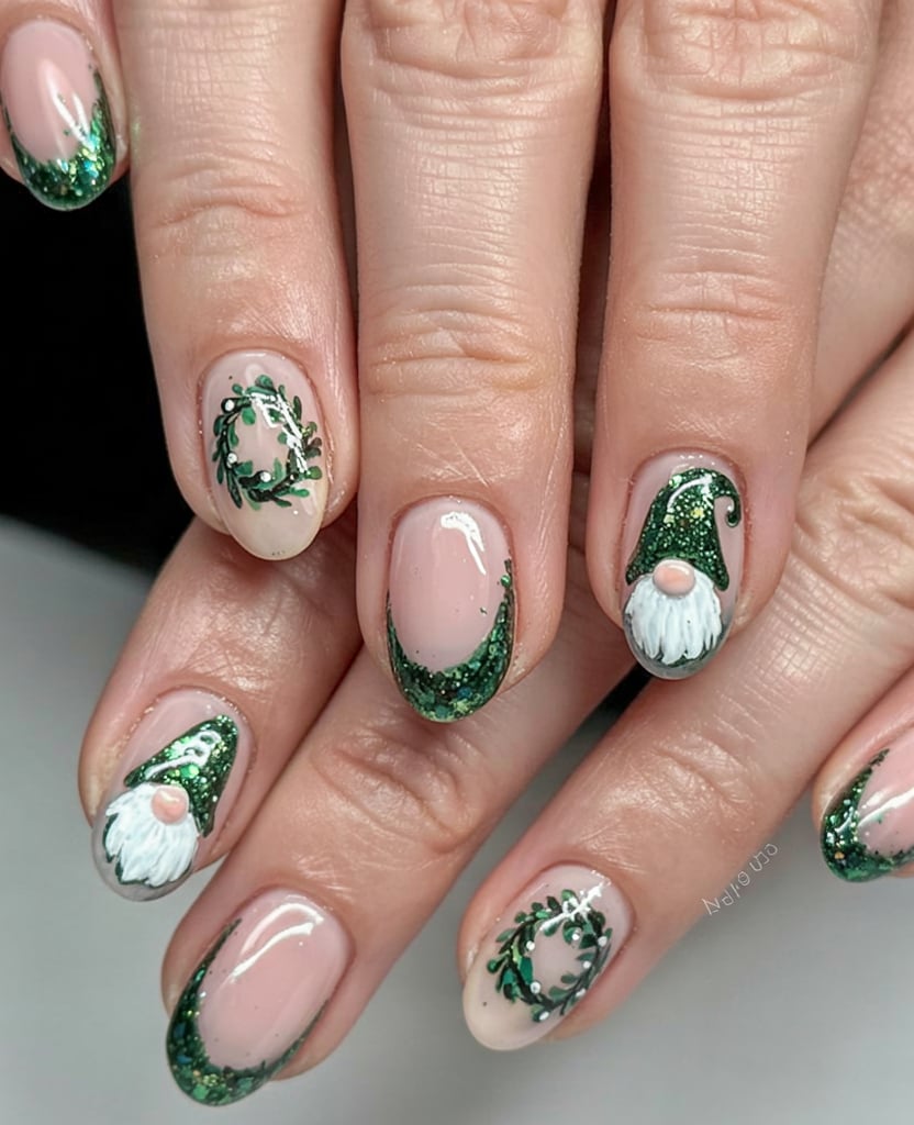 There is something irresistibly cute about little gnomes showing up on your nails. Here, green glittery hats and tiny wreaths serve to infuse a cozy, storybook feeling. It feels like a little fairytale world right at your fingertips-upperhand for any gnome-lady who loves a little whimsy in her holiday look.