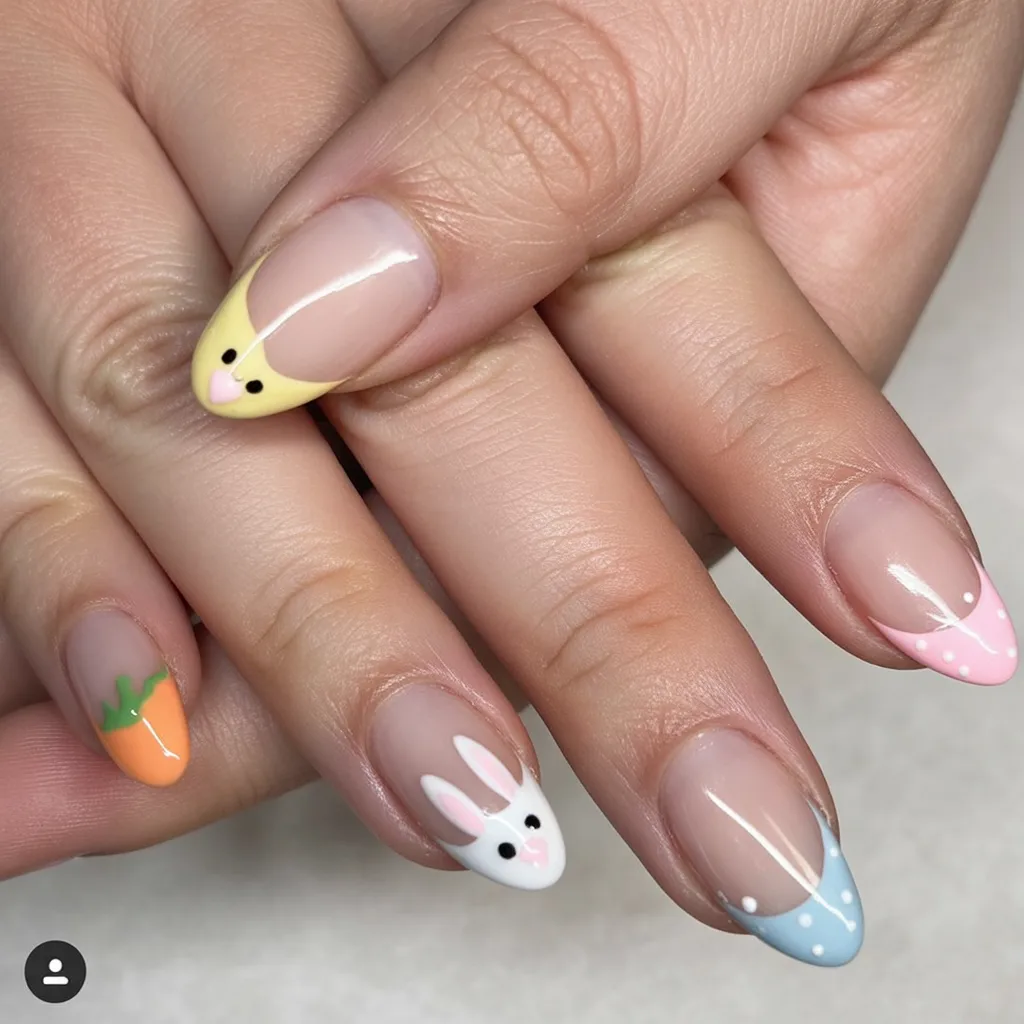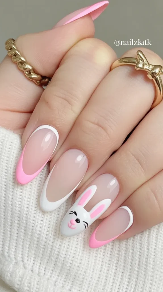 These almond nails combine pastel French tip accents with a sweet bunny detail. The soft tones create a gentle and elegant look.