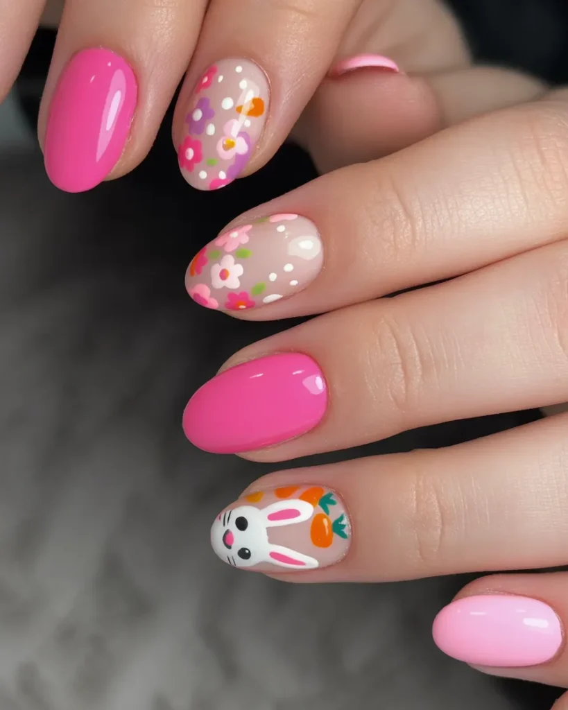 18. Bright Floral Bunny Pink Nails