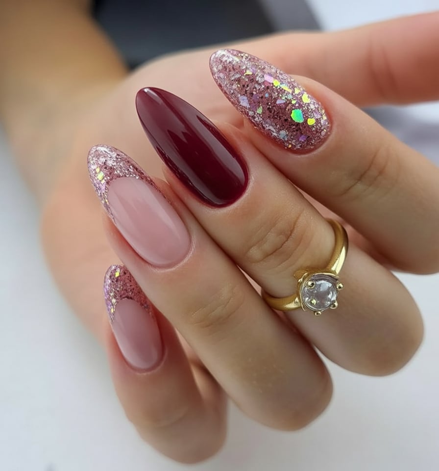 These nails play a middle ground between bold and soft – a mix of burgundy polish and pink glitter fades and nude accents. They are very confident and at the same time possess a soft femininity.
