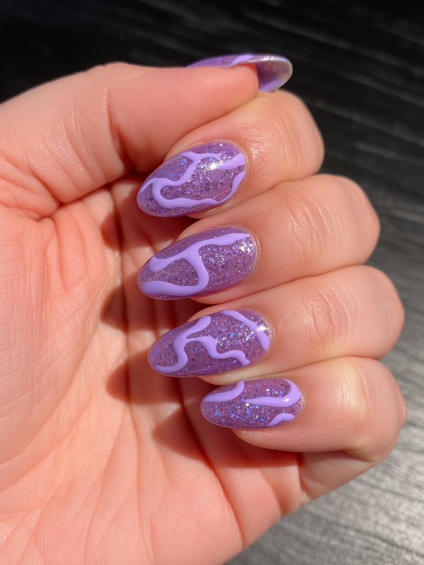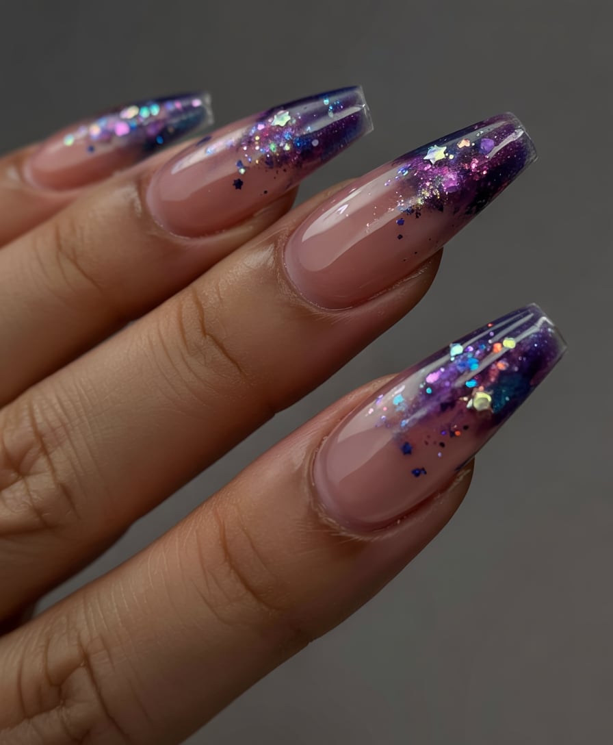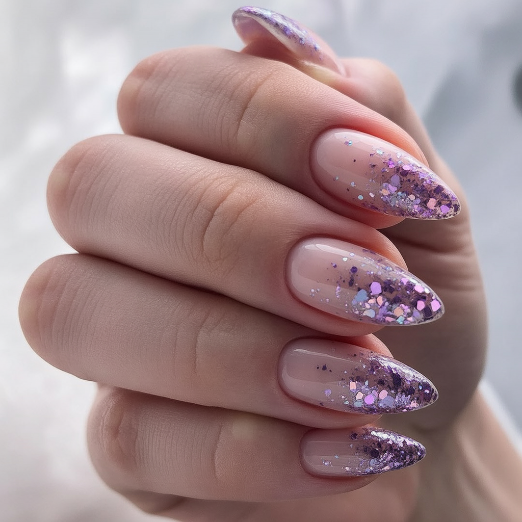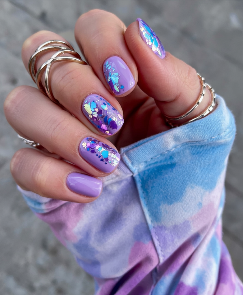 Such nails are dreamy and romantic, soft purple glitter over a natural base, almost confetti falling down in slow motion. They are not excessive but still quirky enough to wear on the occasions you feel like being glitzy and not dramatic.
