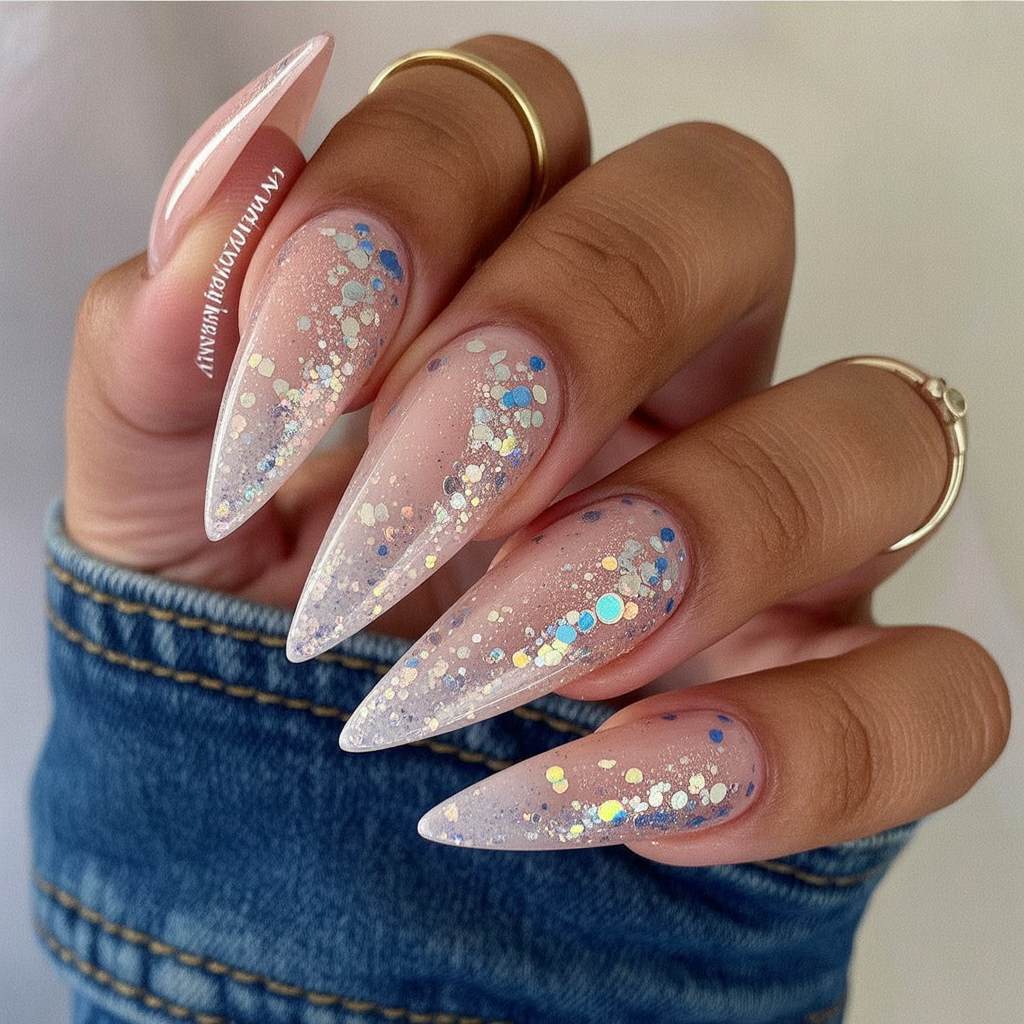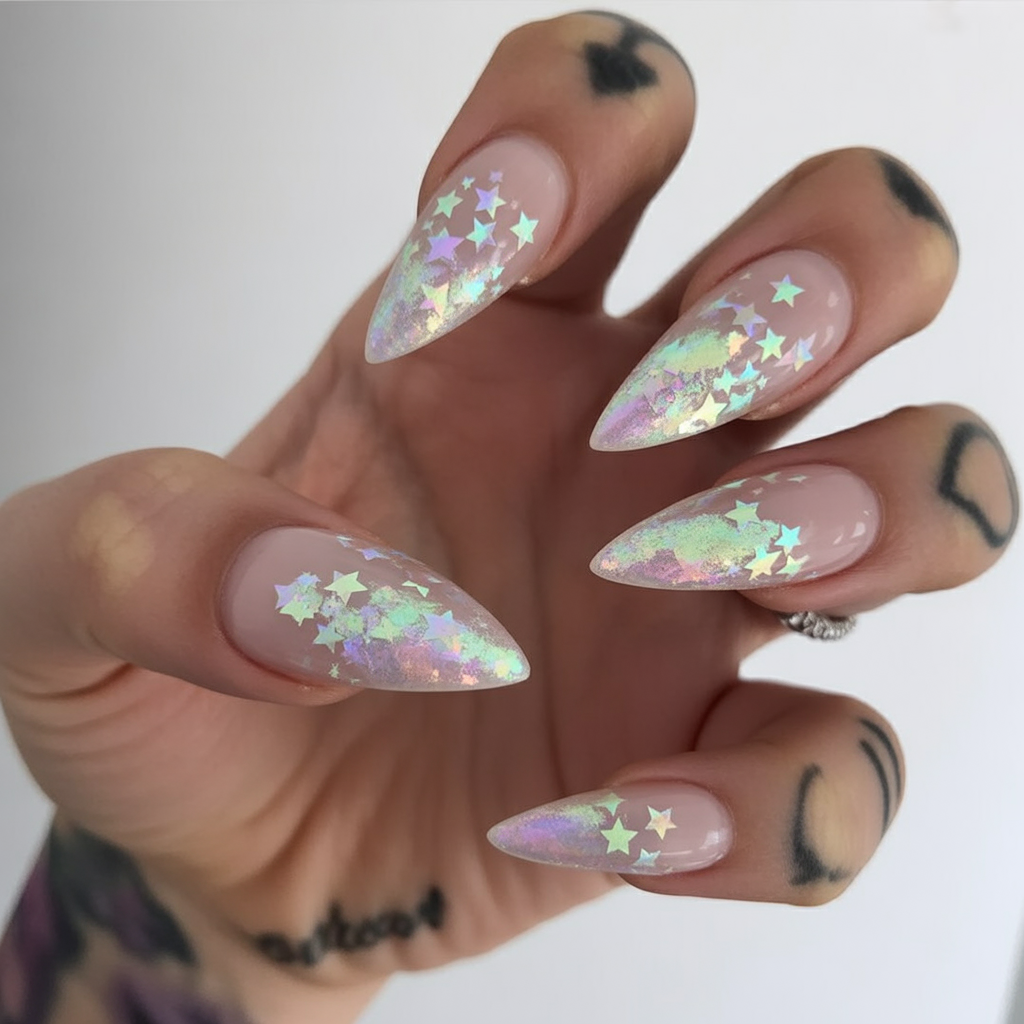 This design is celestial and captivating with iridescent flakes and the star shapes scattered on nude stiletto nails. It is like having a bit of the night sky with you and it is magic and sparkly.