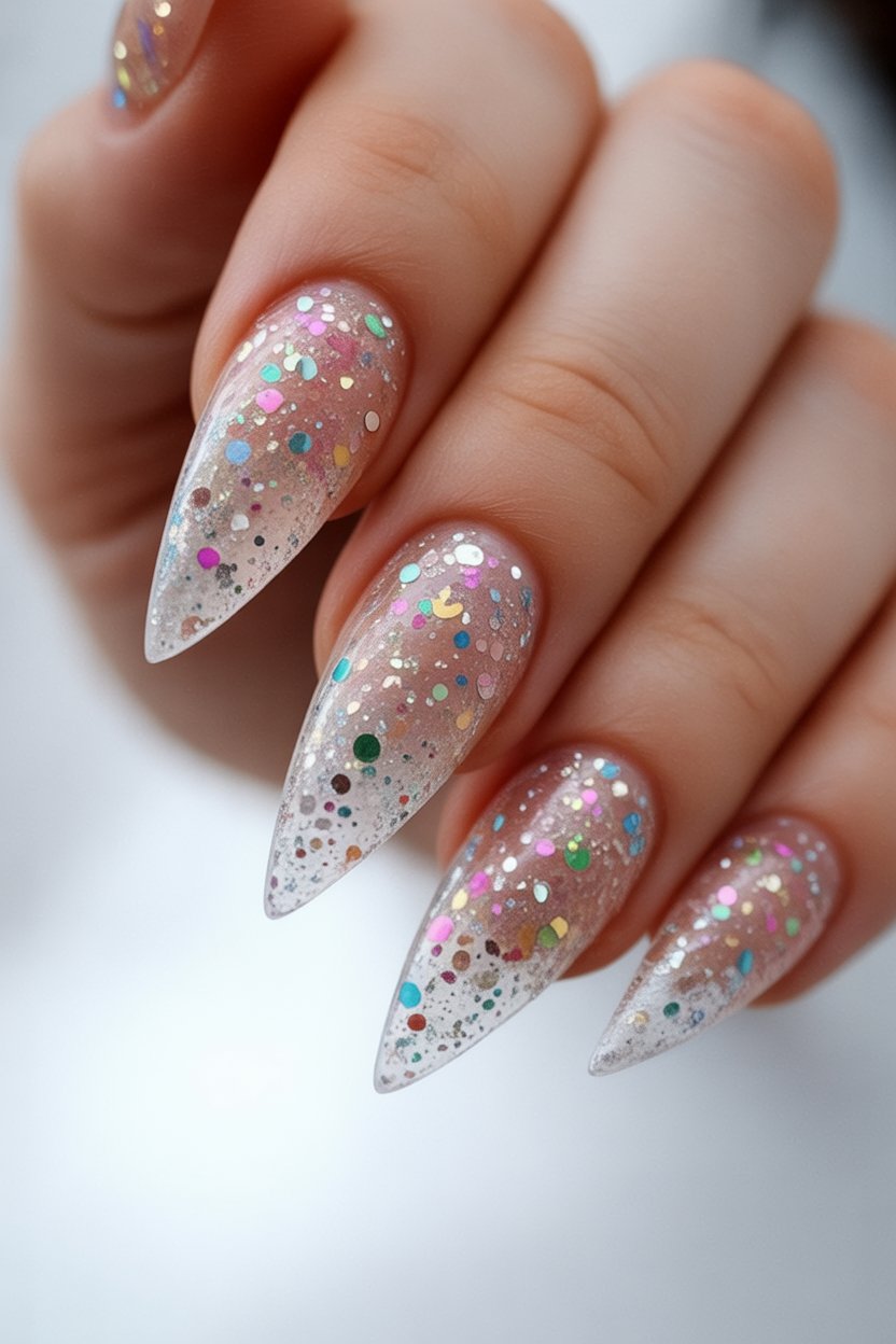 These nails are like a party on your fingertips- crisp stiletto ends that are dotted with glittery party-coloured confetti. They ooze fun, as a champagne popping at a party and have an immediate effect of carefree jubilation.
