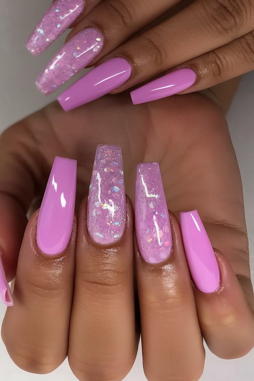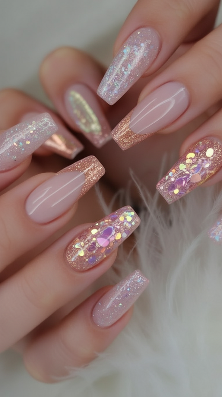 They particularly suit long square acrylic nails, because the length lets the various textures become really noticeable. It is a popular mix-and-match glitter pattern that is trendy in 2025 and that everyone who enjoys mixing it up and prefers their nails to feel like an accessory will love.