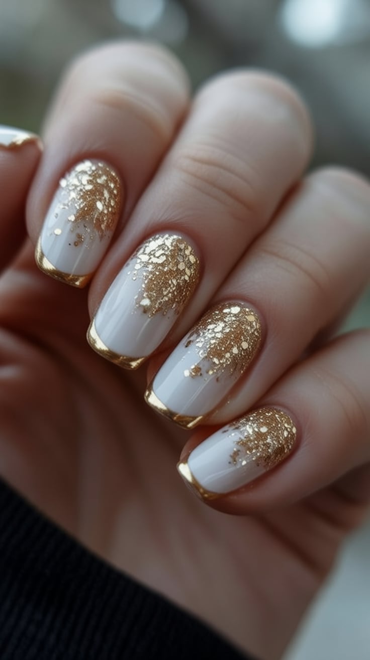 Polished and sensual, these nails are made of white and golden glitter overheating down the tips. They are practically dipped-in-gold French tips, smooth and automatically glamourous.