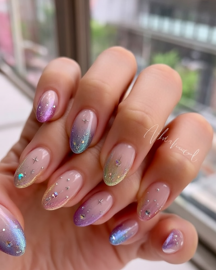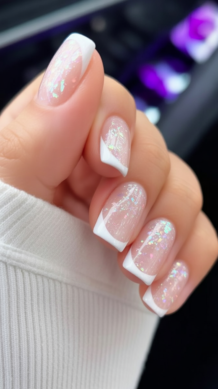 These nails are a classic-meets-modern combination of crisp white french tips and glittering iridescent over a clear base. It is classic yet it has been updated in 2025 so that they do not feel outdated.