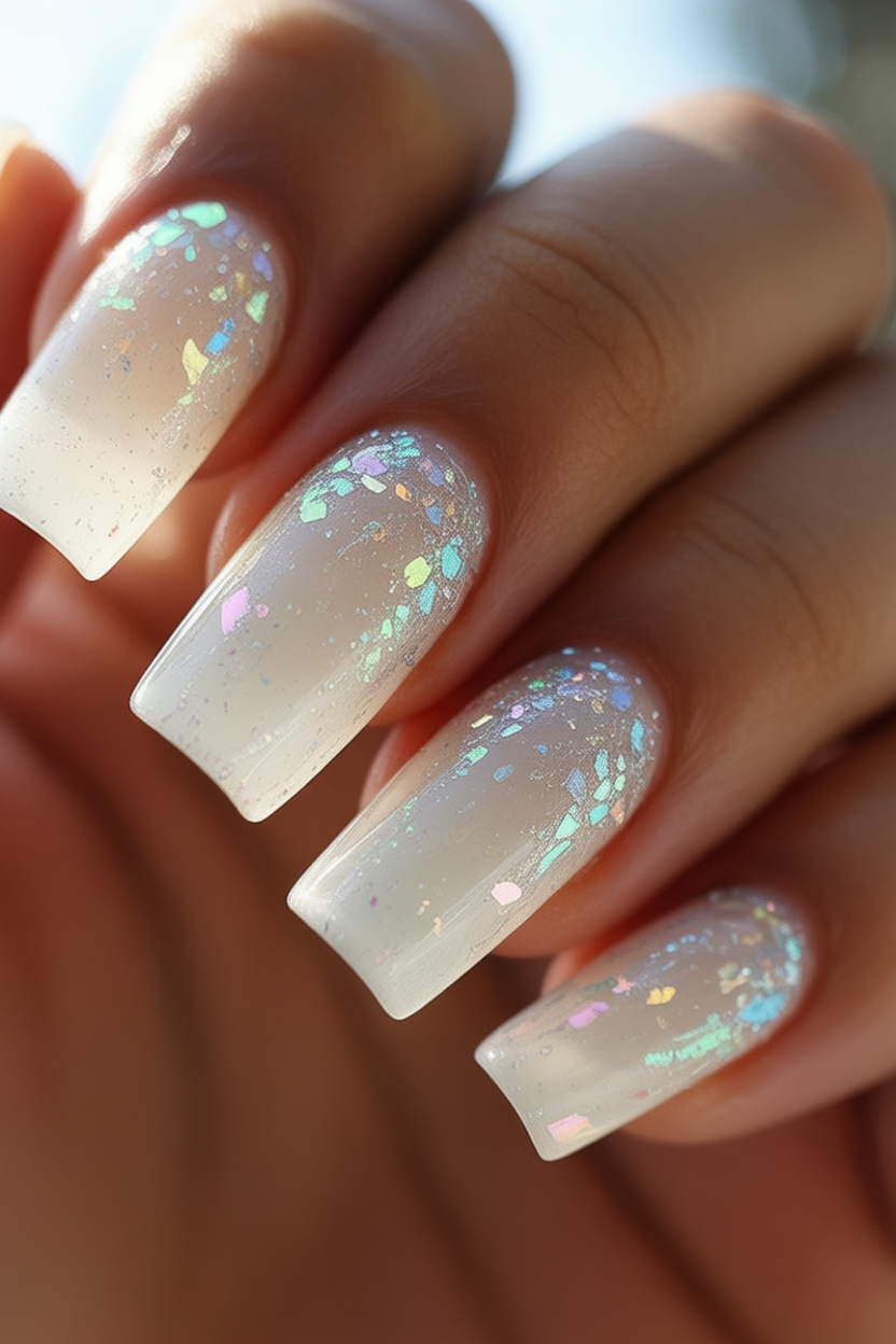 It is an angelic prettiness of these nails, as though they were sprinkled with bits of mother-of-pearl. The white translucent polish made with iridescent glitter changes in the light-giving them a magical, underwater look.
