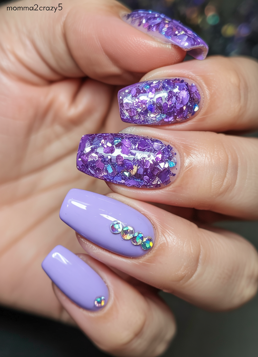 Loud and not shy, these nails combine thick purple glitter with glossy lavender polish and rhinestone decorations. They are vibrant, shiny and bold.