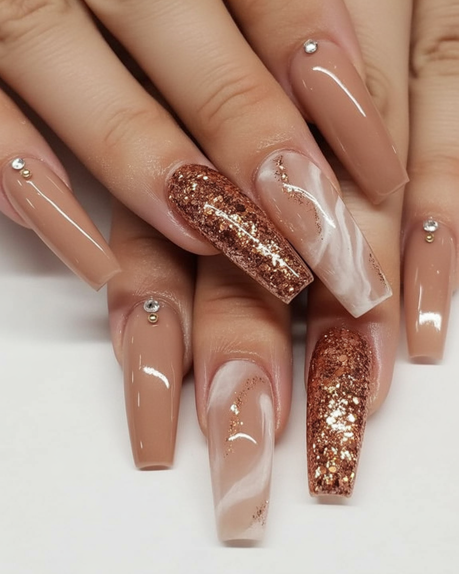 This set is rich and earthy with bronze glitter with nude polish and marble accents. It is perfect without being loud and it is glamorous, especially to women who are fond of warm tones.
