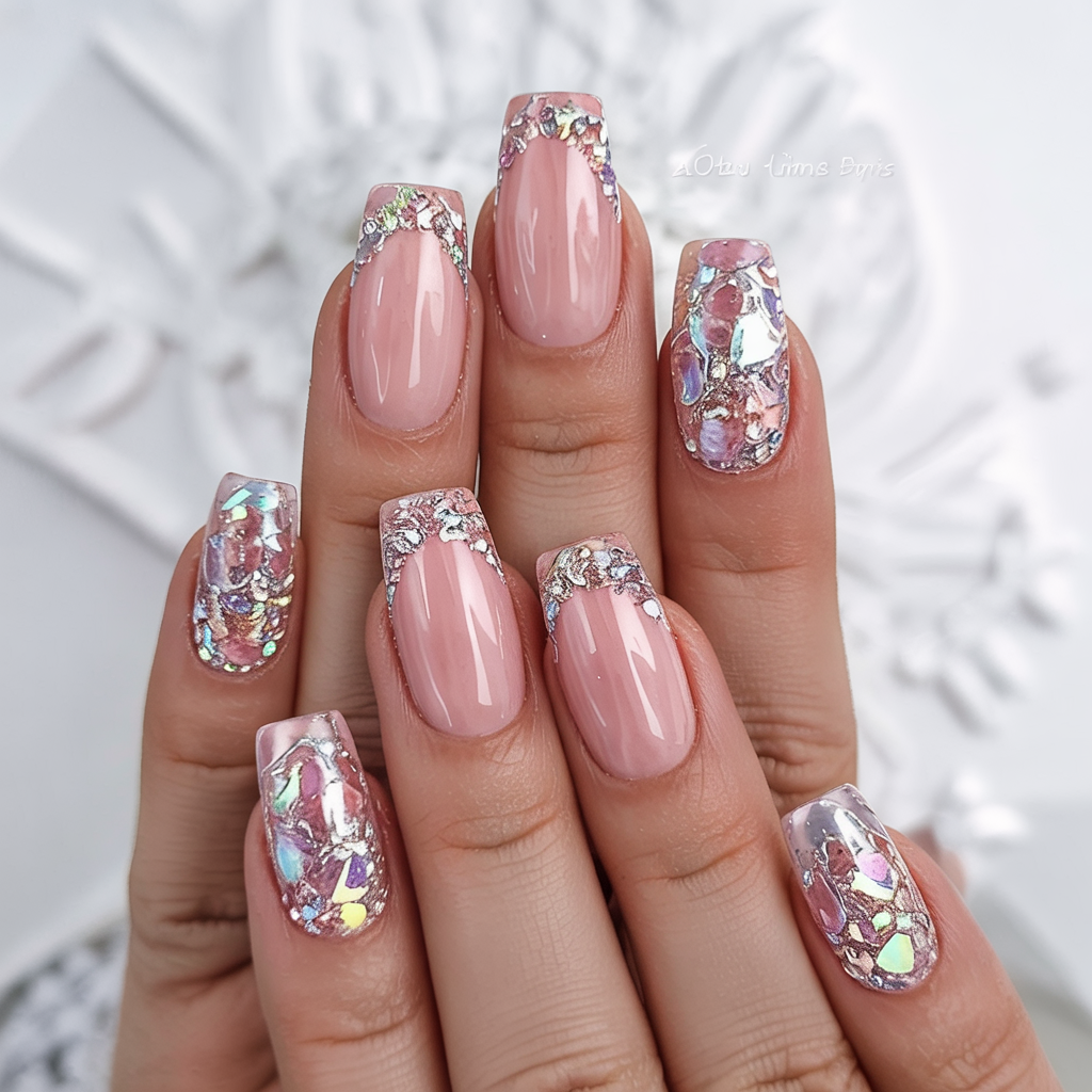 It suits best on medium square nails and is very flattering to any person who likes subtle sparkle with a playful feel. They are particularly beautiful in spring weddings or a date night when one desires nails to be soft and classy.