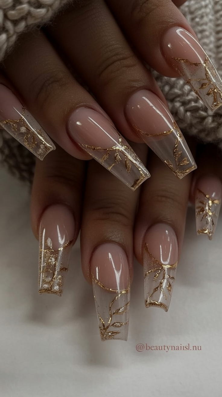 this is an excellent style when to coffin shapes, and this allows the gold work to be prominent. They suit best in official events or in autumn parties, when the golden shades play on the light. The gold accents and a clear polish make them everlasting and ever so classy.