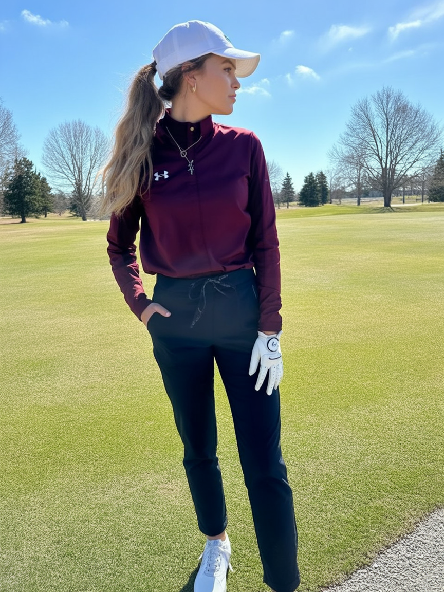 This look works well on those who tend toward cold skin or prefer playing in cold weather during the winter months or the winds of autumn but don’t want the burden of bulky outerwear. These long pants are flattering on most shapes and figures if one prefers a straight and straightforward look that appeals on and even off the links. Just layer with the thin base layer material on chilly days and complete this ensemble with a thin chain necklace and small hoop earrings so it remains sufficiently fashionable. This will give the wearer the traction of staying warm with the flexibility of movement that still carries sufficient slack for head-turning poise right after the game at that casual dinner engagement.
