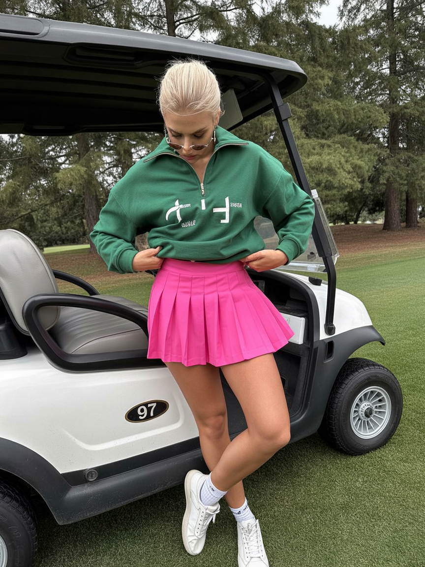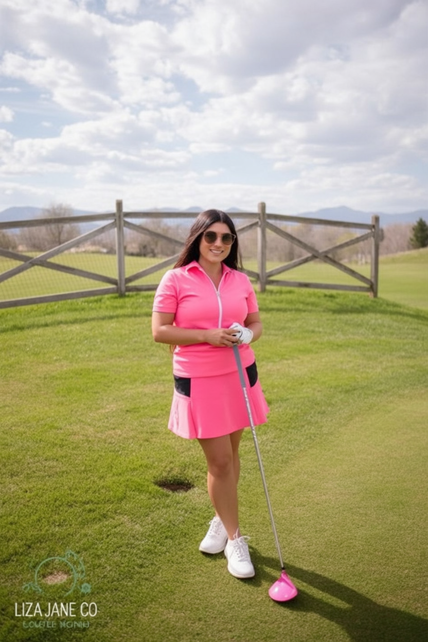If you love showing a little personality on the course, this hot pink skort set is pure joy. The zip-front top feels sporty and streamlined, while the matching skirt adds just enough swing to keep things flirty. The bright color pops beautifully against rolling greens and big skies, giving strong summer energy even when the breeze is a bit chilly. It’s fun, unapologetic, and exactly the kind of look that makes women’s golf outfits in 2026 feel fresh instead of fussy.