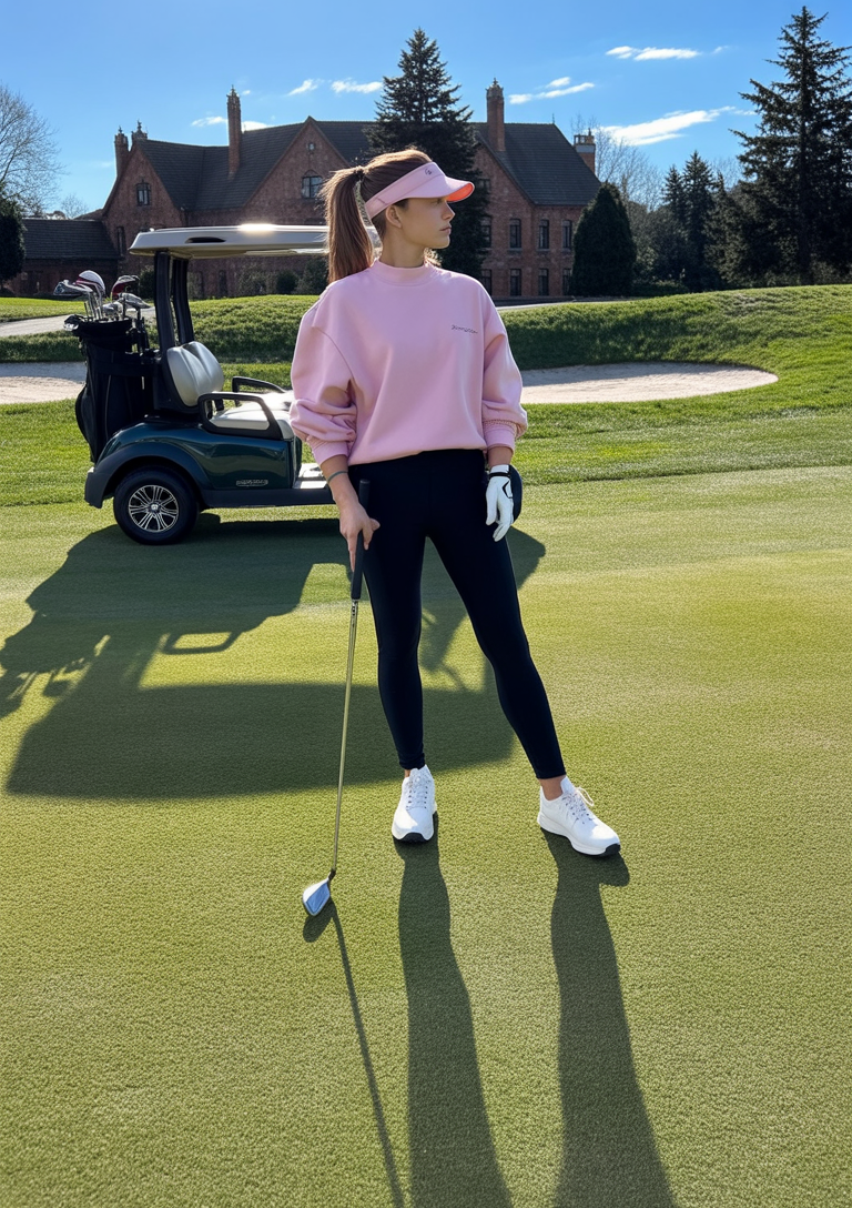 If your ideal golf day feels more like a relaxed walk than a tournament, this soft pink sweatshirt and black leggings combo is exactly the mood. The oversized top brings a cozy, almost lounge-like feel, while the sleek leggings keep the silhouette modern and flattering. It’s perfect for a casual practice session, a laid-back league night, or an indoor simulator round when you’re there as much for the conversation as the score. The visor and white sneakers add a sporty touch so you still look ready to play, not just run errands.