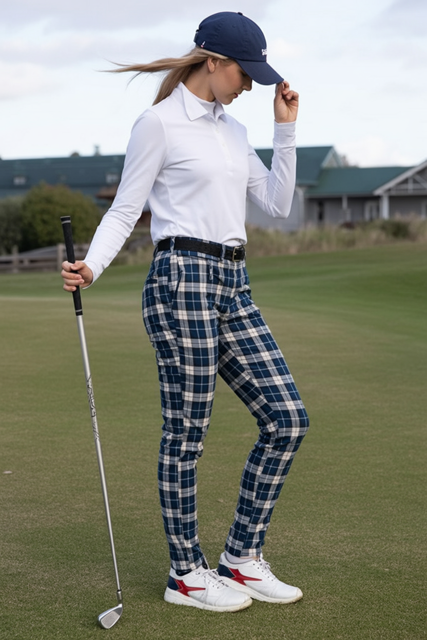 This look shows how golf outfits for women in 2026 can be playful and polished at the same time. The crisp white top feels fresh and clean, while the navy-and-cream plaid long pants bring that classic country club charm without tipping into costume. It’s the kind of outfit you reach for on a breezy morning round when you still want to feel put-together walking to the first tee. The cap and simple sneakers keep the vibe casual and relaxed, but there’s still a quiet, confident chic energy in the way it all comes together.