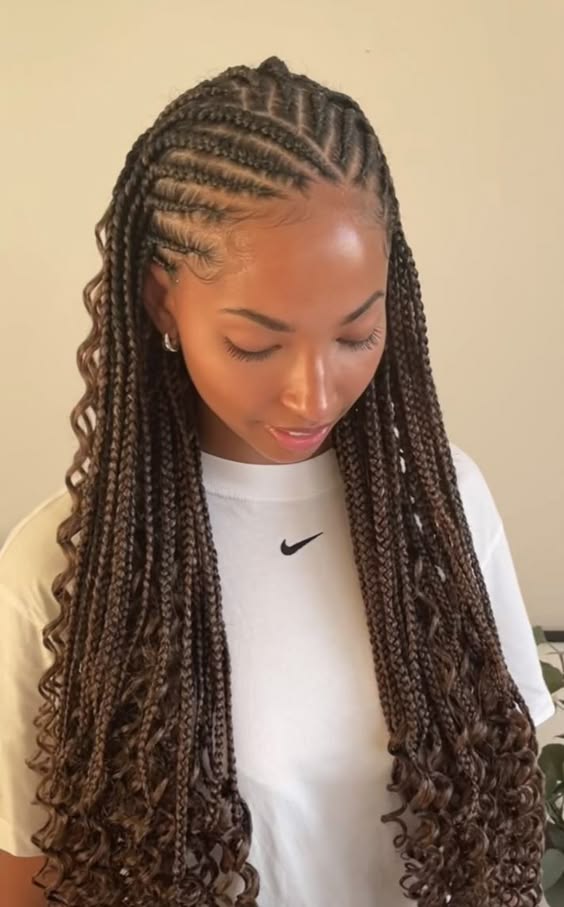 This hairstyle features tight cornrow braids flowing seamlessly into long, loose curls. The intricate braiding along the scalp creates a neat, polished look, while the curly ends add a touch of softness and movement, making it ideal for any casual or formal setting.