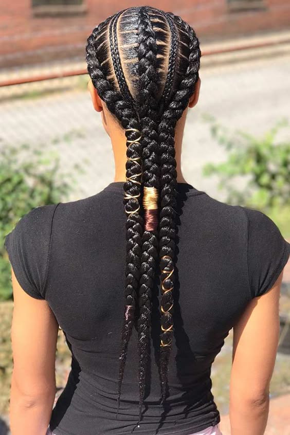 This feed-in braid style features thick cornrows accentuated by gold thread wraps for a stylish touch. The braids cascade down the back, combining simplicity and elegance, enhanced with the metallic detailing for a hint of glamour.