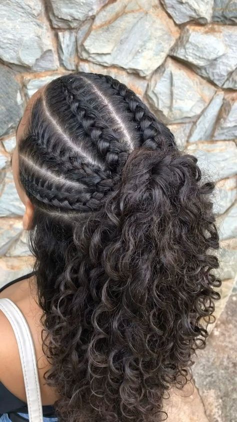 This half-up, half-down style showcases cornrow braids on the top half of the head, transitioning into loose, natural curls. The combination of structured braids and free-flowing curls creates a balanced look, ideal for both relaxed and semi-formal occasions.