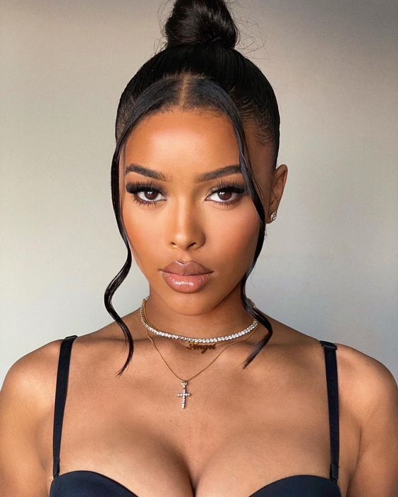 A high bun styled with sleek, smooth edges and two loose, face-framing curls. This elegant updo combines simplicity with a soft, romantic vibe, perfect for formal events or a polished everyday look, emphasizing the wearer’s facial features.