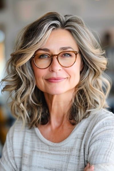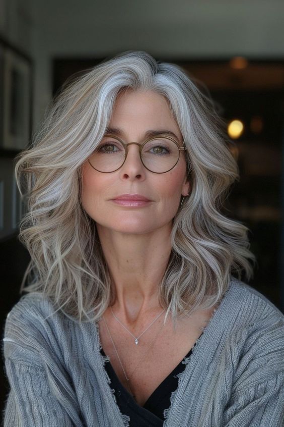 Silver hair styled into soft, flowing waves exudes elegance and sophistication. This hairstyle is perfect for mature women who want to embrace their natural hair color while keeping a stylish and youthful appearance. The waves add volume and movement, making the hair look fuller and vibrant. The sleek, thin-framed glasses add a contemporary touch, perfectly balancing the overall look.