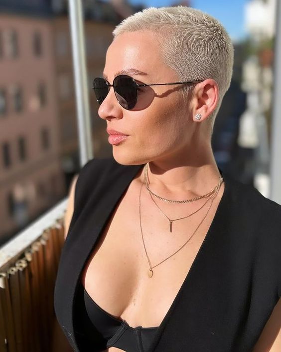 A short cropped hairstyle is not only chic but also incredibly convenient for women on the go. This look, with its minimal styling needs, emphasizes the facial features and is particularly effective in highlighting the cheekbones and glasses. The light gray tone adds a touch of modernity and can be a great way to transition into embracing natural hair color. This style is versatile enough to work with both casual and formal attire, making it a superb choice for a dynamic lifestyle.