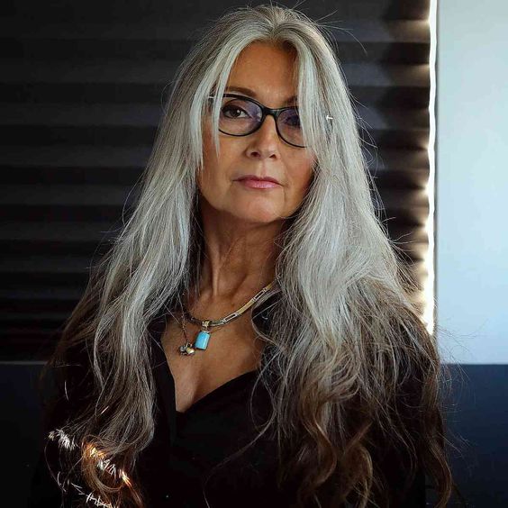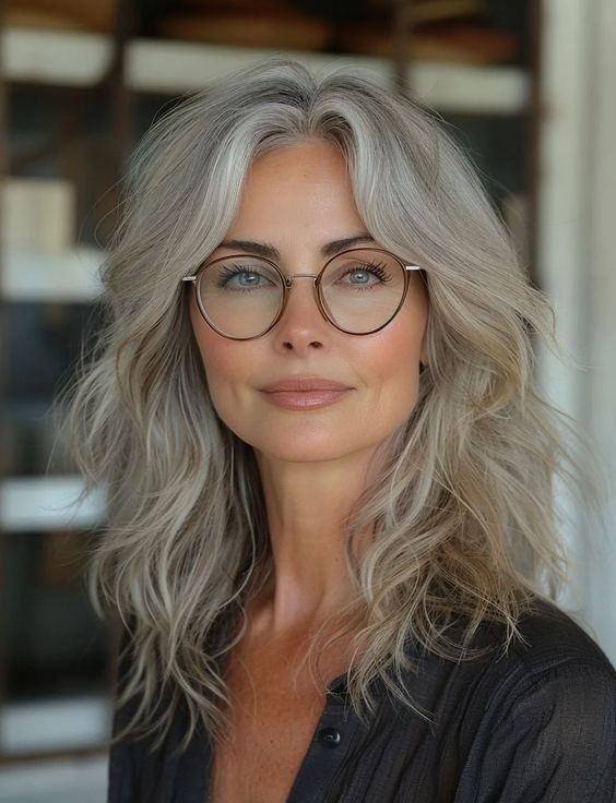 Long, luxurious silver hair offers a bold statement of beauty and confidence, making it a standout choice for women who embrace their natural aging. This hairstyle cascades in smooth waves, providing a striking contrast with dark clothing and accessories. Paired with sleek, modern glasses, it’s a look that speaks volumes about elegance and self-acceptance.