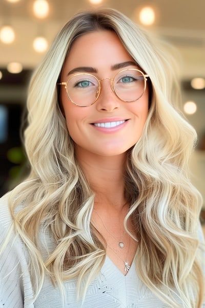 The luminous long waves in this hairstyle are perfect for adding volume and texture, making it an ideal choice for women with thin or fine hair. The light blonde color adds a radiant touch, enhancing facial features and complementing the stylish round glasses. This look is versatile and can be dressed up for formal events or styled casually for everyday wear.