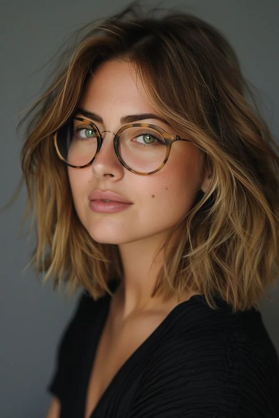 This textured bob is the epitome of effortless chic, perfect for the modern woman. The layers are cut to create a voluminous, tousled look that complements the natural hair texture. The light brown highlights add dimension, enhancing the depth of the style. Paired with minimalist round glasses, this hairstyle is ideal for those who want to look polished without spending too much time on hair maintenance.