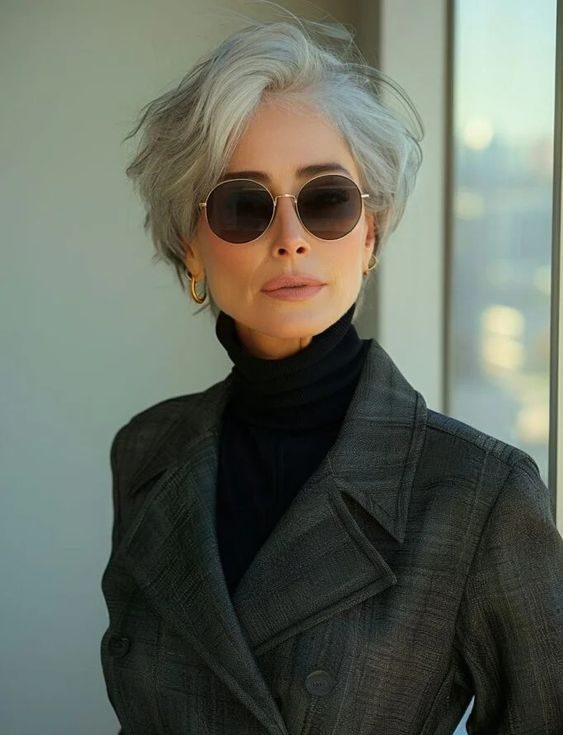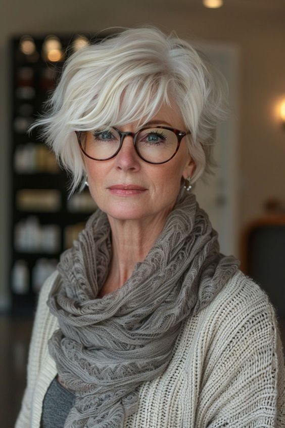A short, layered hairstyle can look exceptionally stylish when paired with the right accessories, like a cozy scarf. This look combines the practicality of short hair with the aesthetic appeal of soft layers that frame the face beautifully. The gray scarf not only adds warmth but also complements the silver strands of the hair, creating a harmonious look perfect for fall and winter seasons.