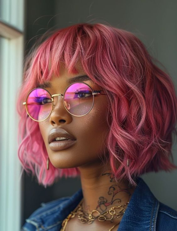 For the more adventurous, a bold pink wavy bob can be a stunning option. This hairstyle is perfect for those looking to make a statement. The vibrant pink shade complements darker skin tones and stands out in any crowd, while the waves add volume and depth. This look pairs wonderfully with round, minimalistic glasses, creating a modern, chic vibe that’s perfect for any age but especially appealing to the younger demographic looking to blend bold colors and personal style.