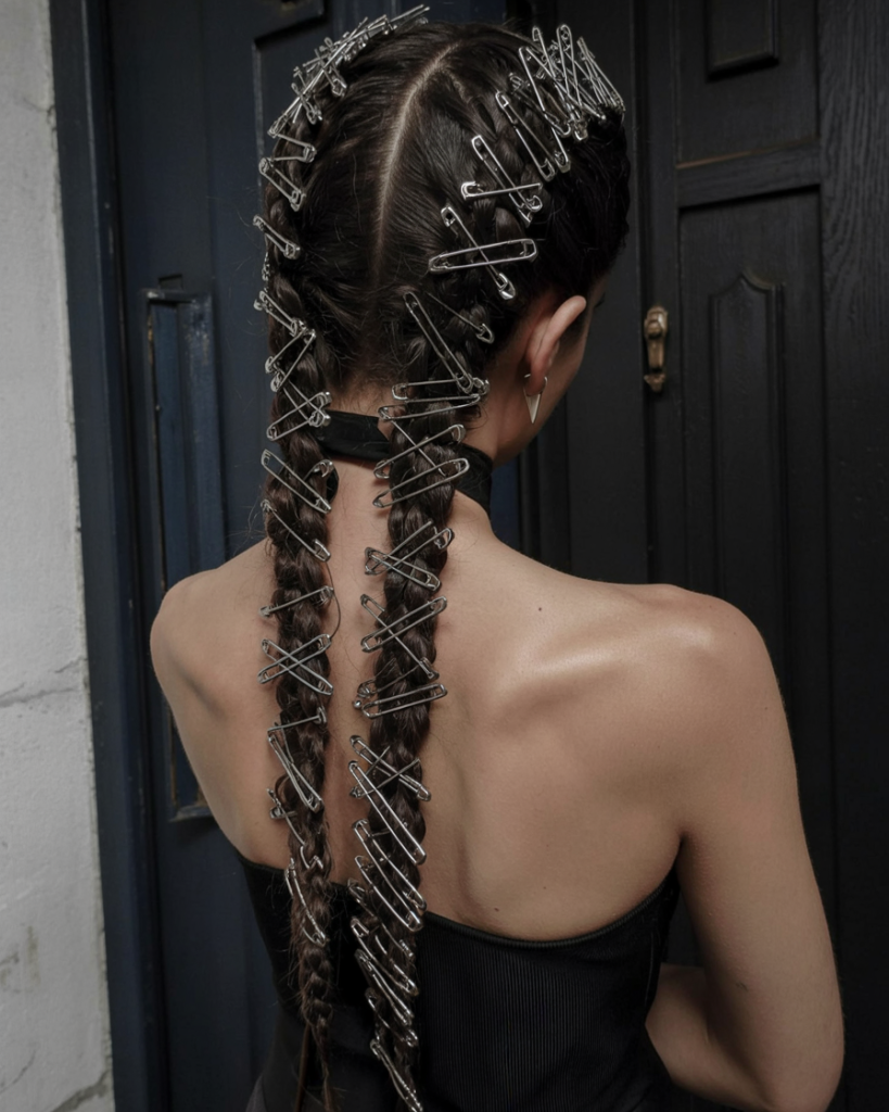 There’s something delightfully dark and post-apocalyptic about these twin braids crisscrossed with silver safety pins. It’s giving Purgecostume meets runway armor, and the statement is crystal clear—don’t mess with me tonight. This look is unapologetic, powerful, and turns a simple braid into a walking piece of art.