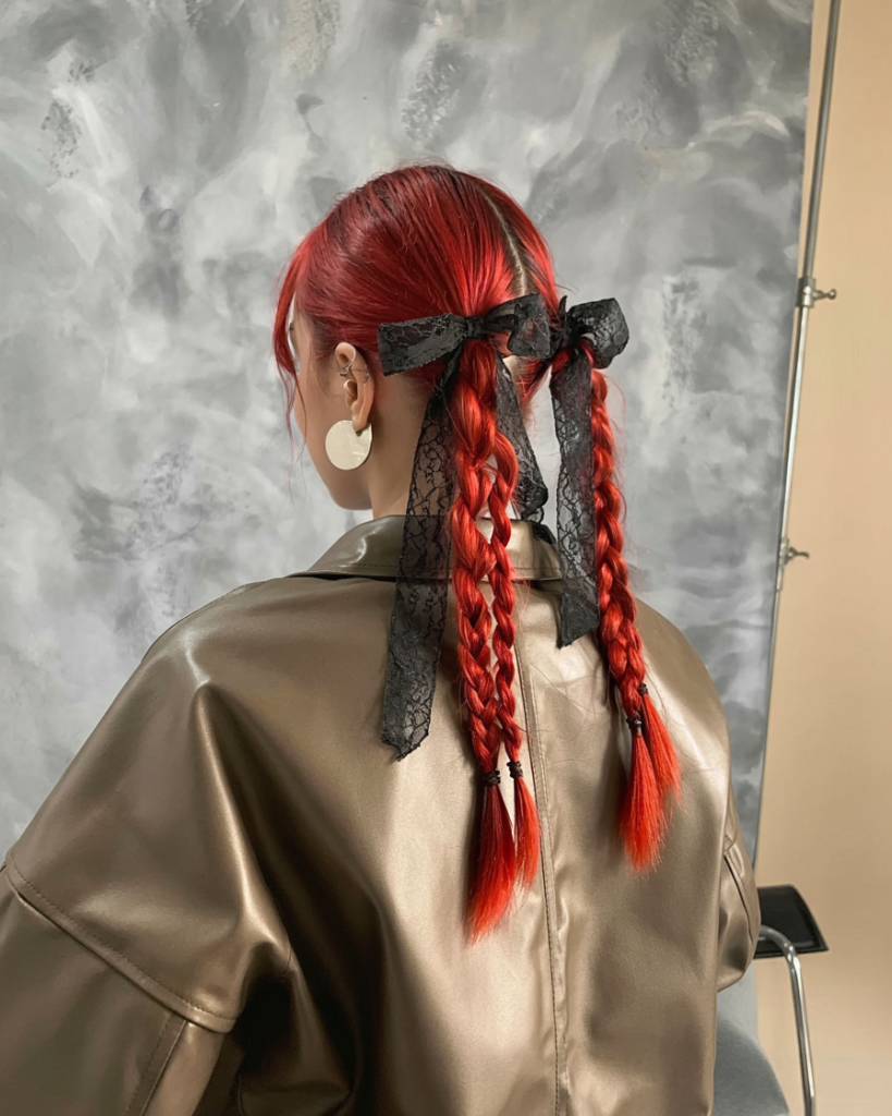 These fiery red braids wrapped with black lace ribbons are pure Halloween magic. The contrast between the crimson strands and delicate lace brings in a little goth romance, like something a Victorian ghost might wear—if she had Wi-Fi and a killer Spotify playlist.