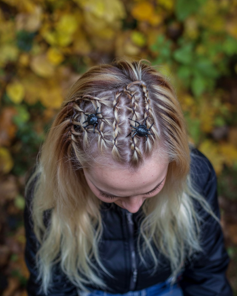 A twist on traditional cornrows, this grid-like braid pattern with mini spiders is unique and playful. It feels DIY but intentional—like a cross between Kids spider fun and runway editorial.