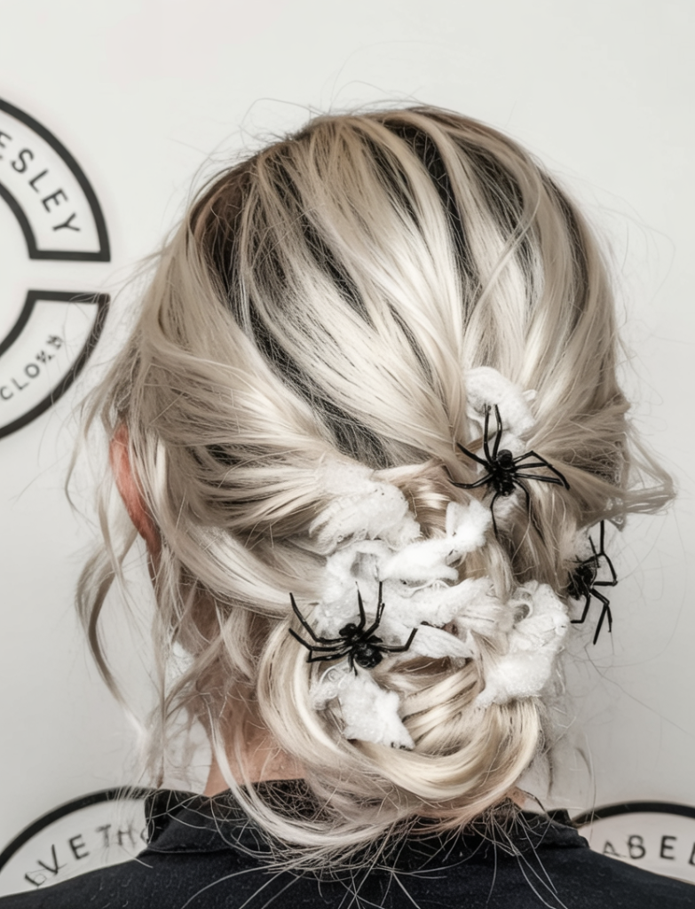 Perfect for formal Halloween events or black women with bleached or silver hair—it adds even more dimension. Use dry shampoo for texture, twist the hair loosely into a low bun, then layer in faux web and clip-in spiders. Chic and creepy all in one.