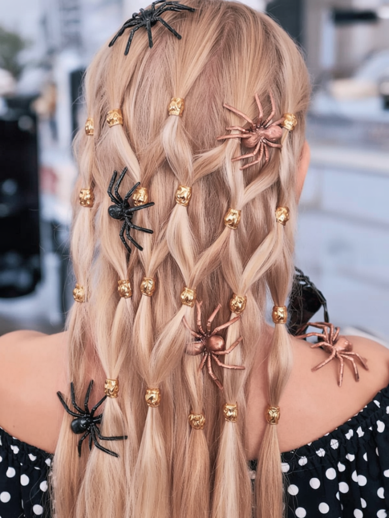 Golden skulls and creepy crawlers? Yes, please. This look plays with texture and shine, mixing soft, romantic braids with bold metallic and plastic accents. It’s a Halloween fantasy—elegant enough for grown-ups, fun enough for kids.