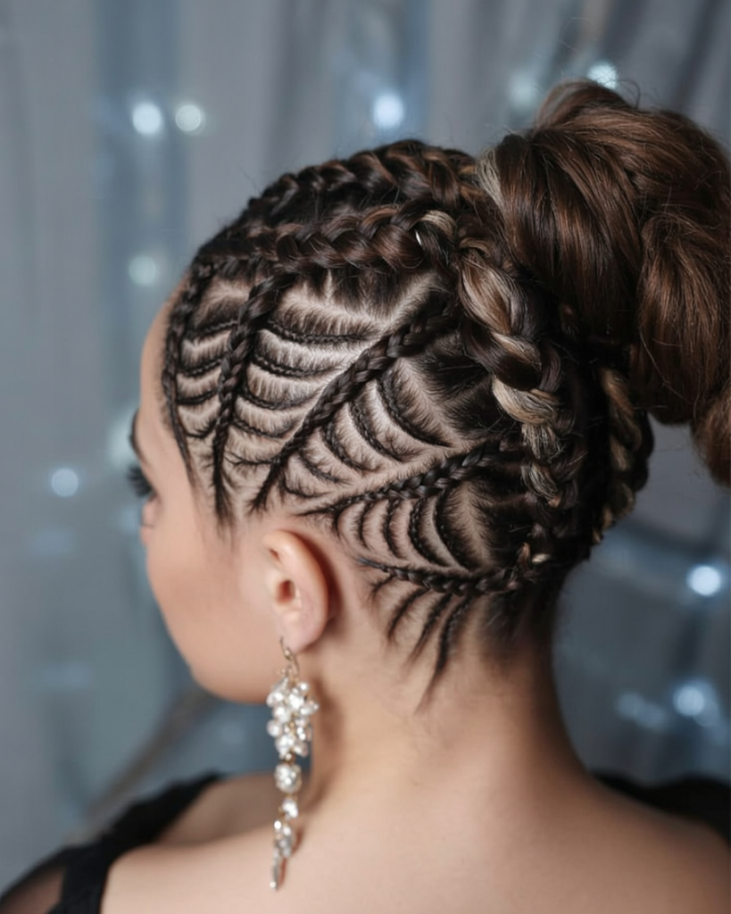 Here’s the ultimate braid artistry—an intricate web pattern woven tight against the scalp, ending in a full bun. It’s a powerful visual that mixes beauty and architecture, making your entire head a Halloween canvas.