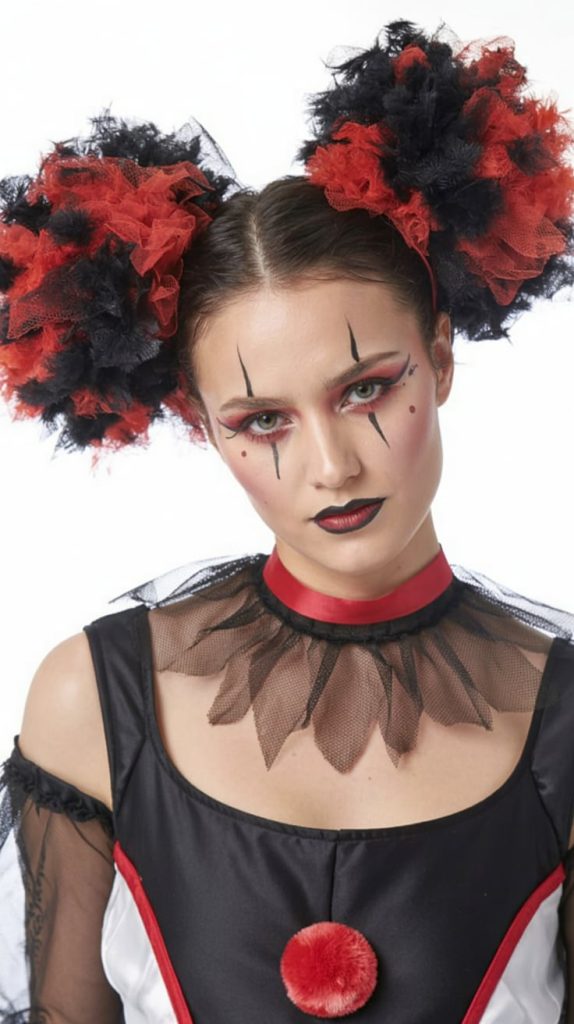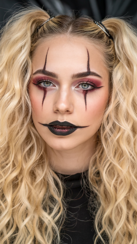 Looking for a look that’s both gorgeous and terrifying? These high, wavy pigtails paired with intense Pennywise makeup hit the mark. There’s a twisted beauty in those wild blonde waves and piercing black lips that make this unforgettable.