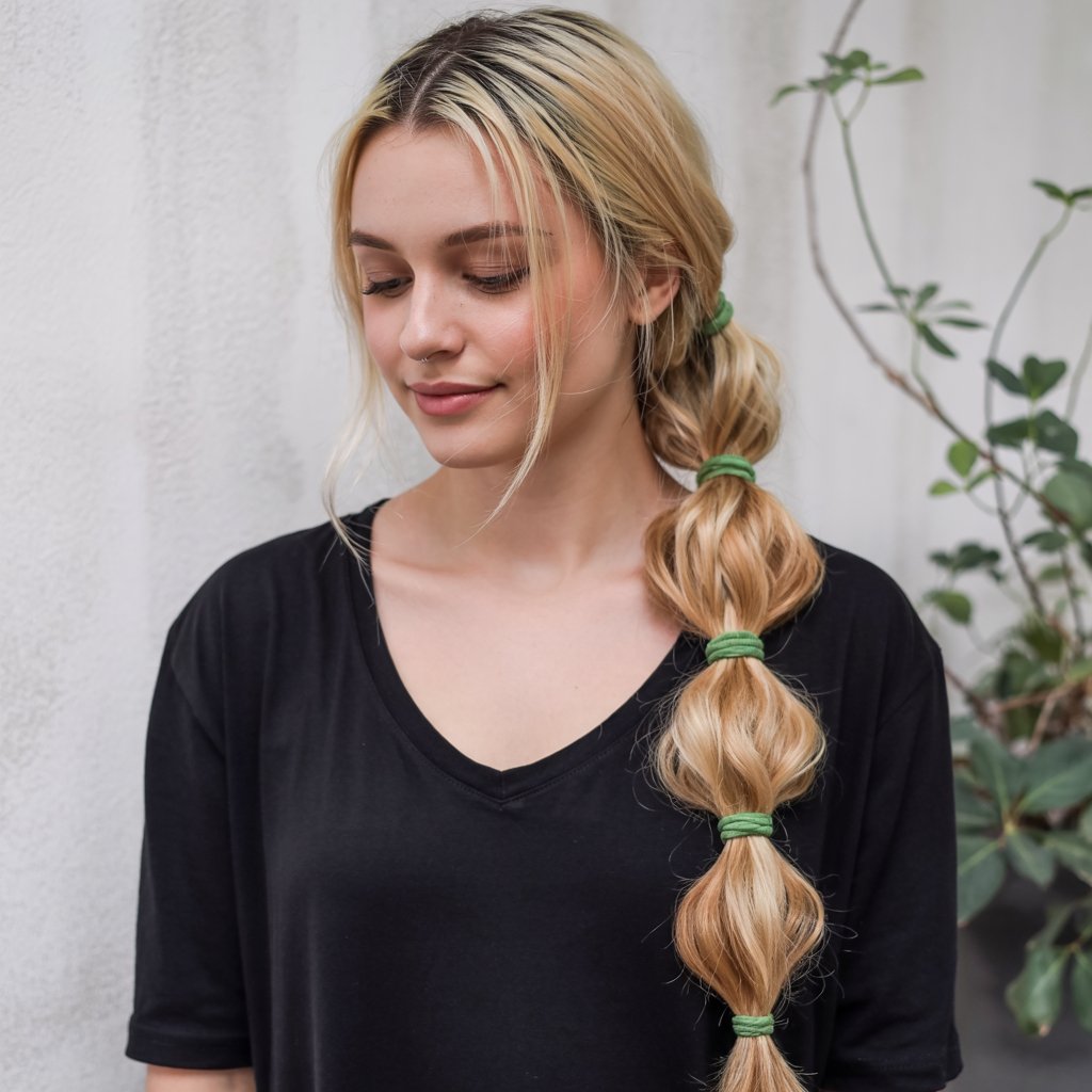 Sweet and deceptively simple, this green-tied bubble braid whispers poison garden energy without shouting it. With soft face-framing layers and plenty of movement, this one feels casual enough for school pick-up—but don’t underestimate her.