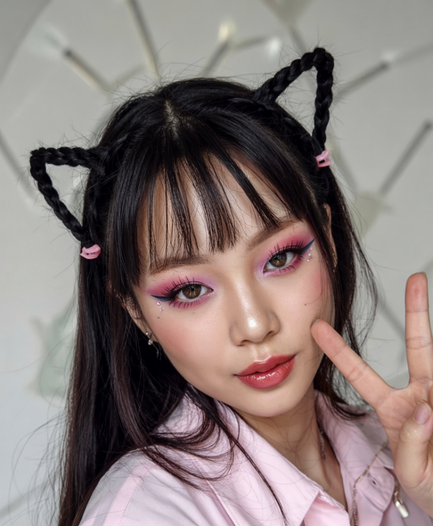 Sweet, sassy, and totally photo-ready—these cat ears are built from braids and secured with soft pink ties for a kawaii Halloween look. There’s a playful innocence to this style, like something you’d wear to a Minute costume party with glitter and giggles.