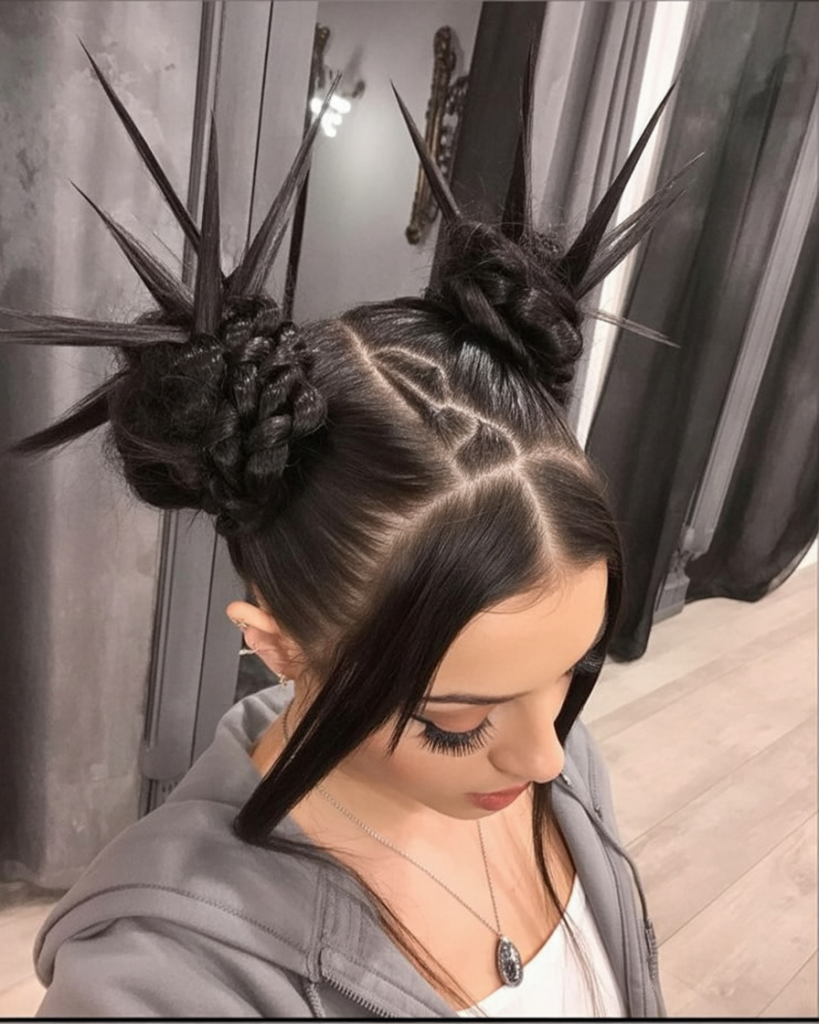 Ready to make a bold entrance this Halloween? These high-shine braided buns with sharp, spiked ends scream confidence and rebellion. They play with texture and contrast—neat parting meets chaotic spikes, and we’re absolutely here for it. It feels like something a futuristic vampire princess would wear to a rave in the woods.