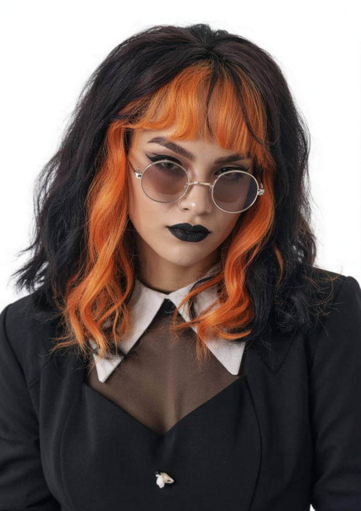 This fiery orange and jet-black duo is serving pure witchy glam with a rock ‘n’ roll twist. The bright bangs frame the face with fiery intensity, like flames licking through a midnight sky. Paired with dark lips and tinted glasses, the whole vibe is mysterious, edgy, and perfectly dramatic for a Halloween soirée.