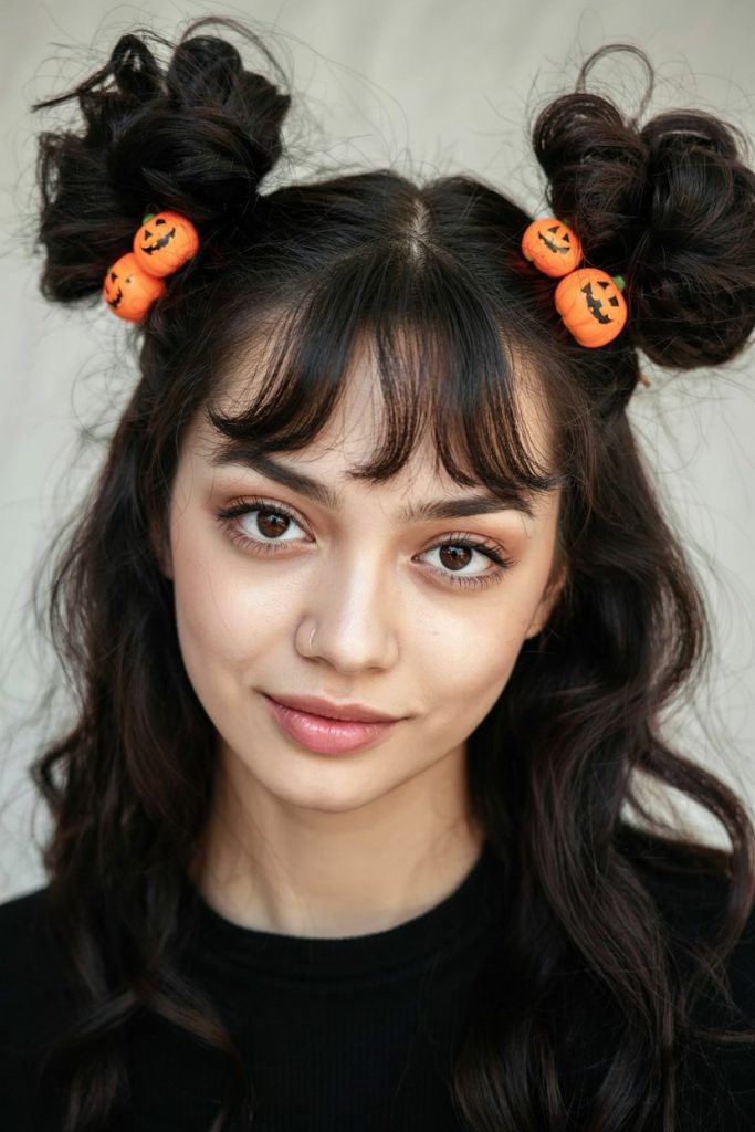 Pumpkin spice with a spooky twist—these space buns feature mini jack-o’-lantern clips nestled in perfectly tousled knots. Fun, flirty, and totally Insta-worthy, it’s the kind of look that gets you compliments in the checkout line.