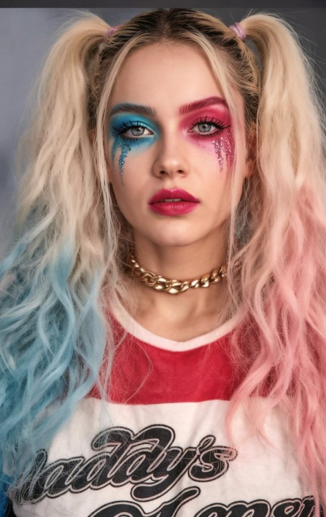 She’s back—and more fabulous than ever. These cotton-candy curly pigtails in pink and blue make you feel like Harley Quinn just strutted off the pages of a comic book into your living room. The whole look says “bad girl, big heart, amazing hair.”