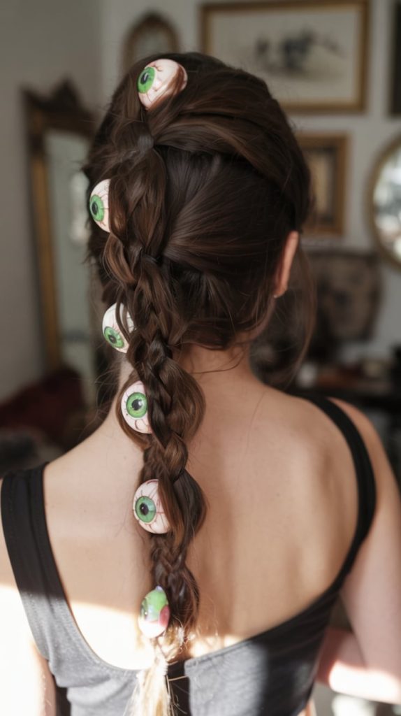 If you want to give people chills—in the best way—this braid adorned with eerie green eyeballs is your moment. It’s playful, freaky, and gives strong Ghost meets artsy-girl-next-door energy. The effect is surreal but approachable, and the attention to detail makes this one unforgettable.