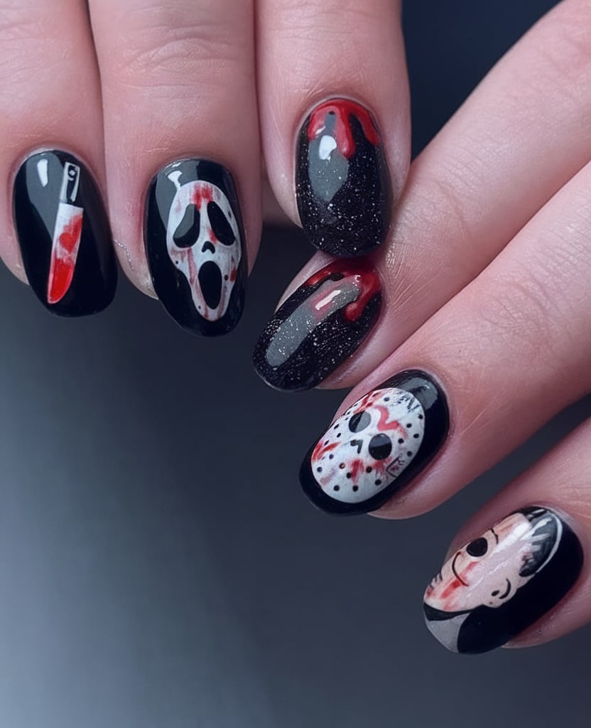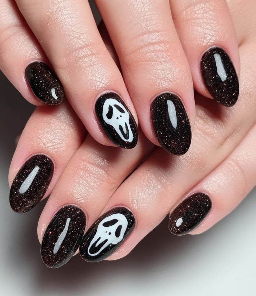 When you combine legendary horror with complete glitter drama what do you have? These nails. The white face of the ghost stands out with the intensity of the movie against the glittering black background. It is somewhat eerie, a bit glam, and very daring.